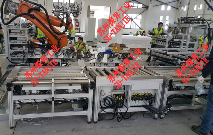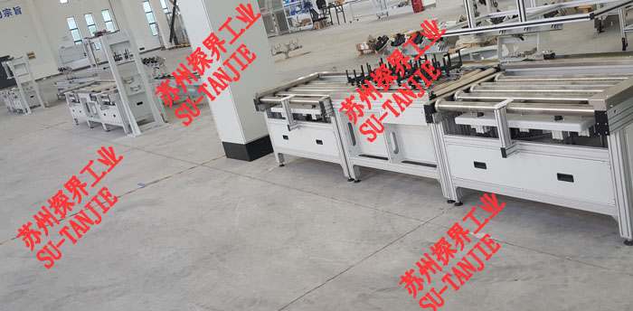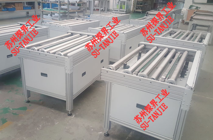 电动滚筒线+定位+移栽集成输送线。使用工况为锂电池检测扫码+下料。