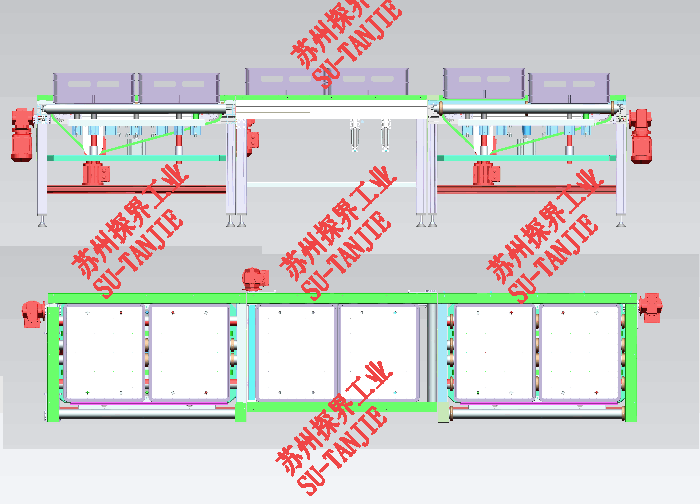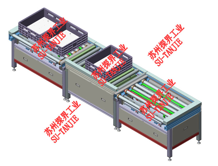 电动滚筒线+定位+移栽集成输送线。使用工况为锂电池检测扫码+下料。